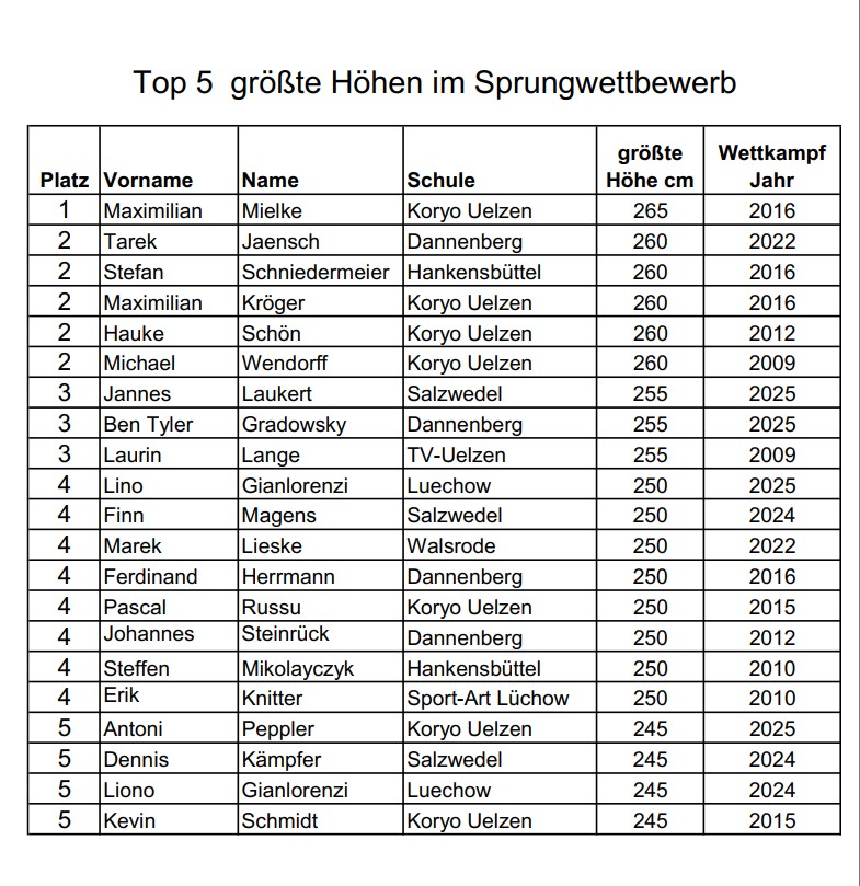 Da wir mit dieser Liste erst 2001 begonnen haben ist an der Spitze noch jeder Platz mehrmals besetzt, aber das wird sich nach einigen Wettkämpfen schon etwas ausdünnen, so das eine eindeutige Reihung entsteht.